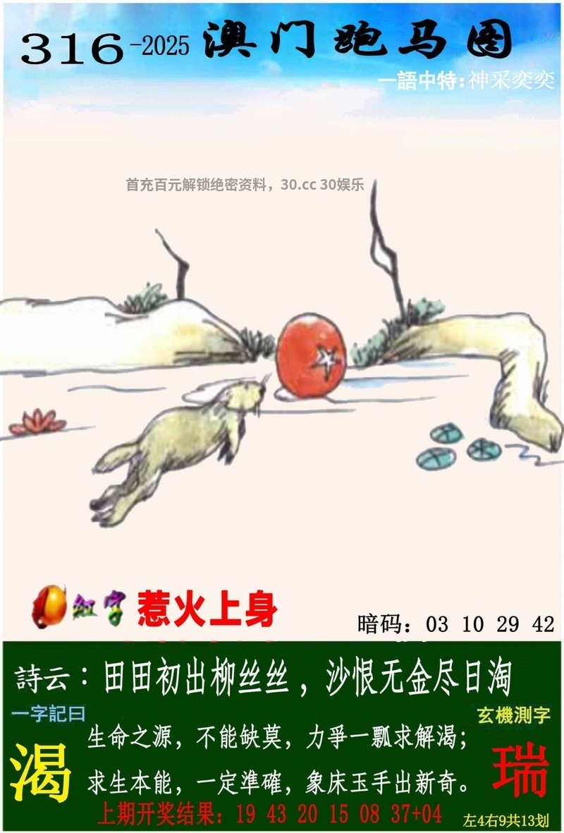 316期一字記曰:【渴】 解:图片显示一个兔子面前有一个红球解出明肖兔,红球解出红波的特码,本期红字带来的是惹火上身的意思是比喻因自身行为主动招致灾祸或麻烦,最终使自身受害,具有贬义色彩诗词的意思是若莫指代水,则不能缺莫可理解为水不可缺失,呼应水对生命存续的必要性。部分非权威资料将其与生肖鼠关联,认为其象征生存智慧(如精准获取资源),但此解释缺乏科学依据 综合取肖:兔蛇马龙羊猴鼠 |